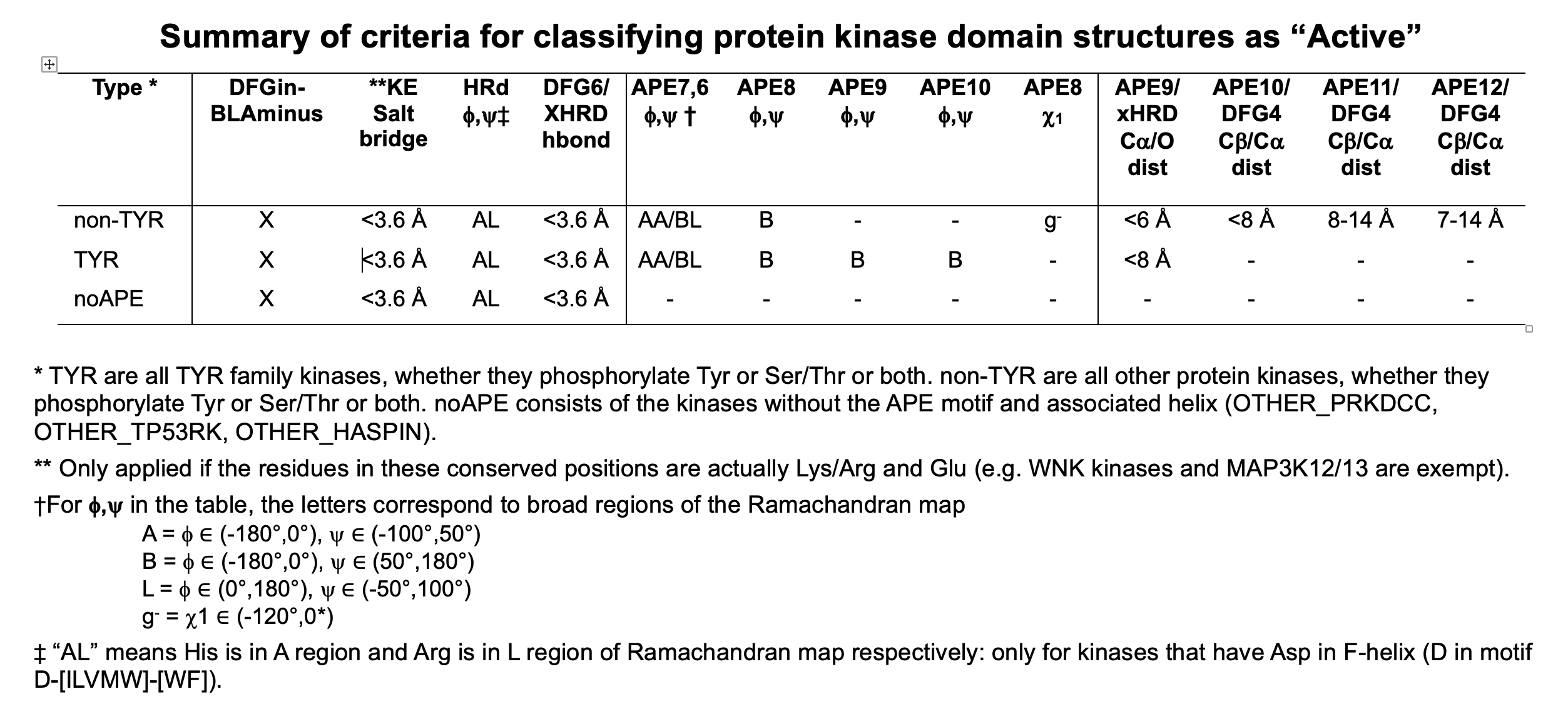 All structures have an ‘Activity’ label based on six criteria: DFGin, BLAminus, the N-terminal domain salt bridge, the HRD motif conformation, and the positions of the N and C terminal segments of the activation loop. Labels corresponding to these criteria are listed in the columns headed by ‘Spatial label,’ ‘Dihedral label,’ ‘Chelix-Saltbridge label,’, ‘HRD label’ and ‘ActLoop label’ presented on every page. Structures must be DFGin, BLAminus, HRD-in, and Saltbr-in to be considered "Active". If atoms are missing, then the structure is considered Inactive. In addition, the ActLoop-NT and ActLoop-CT labels are used to determine if the structure can bind substrates. If residues are missing, then the kinase activity label is "None". If any of these criteria are "out", then the structure is labeled Inactive. Details will be presented in the updated 2026 preprint (above)